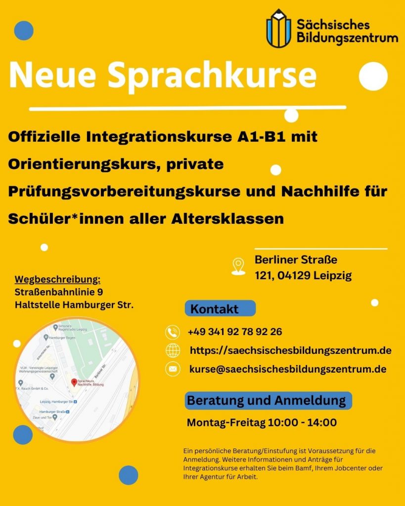 Bereite dich optimal auf die B1-Prüfung vor!Unser Deutschkurs zur B1-Prüfungsvorbereitung hilft dir, deine Chancen auf eine erfolgreiche Prüfung zu steigern.✅ Was wir bieten: Kleine Gruppen für intensives LernenIndividuelle BetreuungStart ab A2-Niveau 📆 Dauer: 8 Wochen🕒 3x pro Woche, jeweils 90 Minuten💰 Kosten: 480 €📍 Ort: Sächsisches Bildungszentrum, Berliner Str. 121, Leipzig📞 Anmeldung: 0341-927 89 225📲 […]